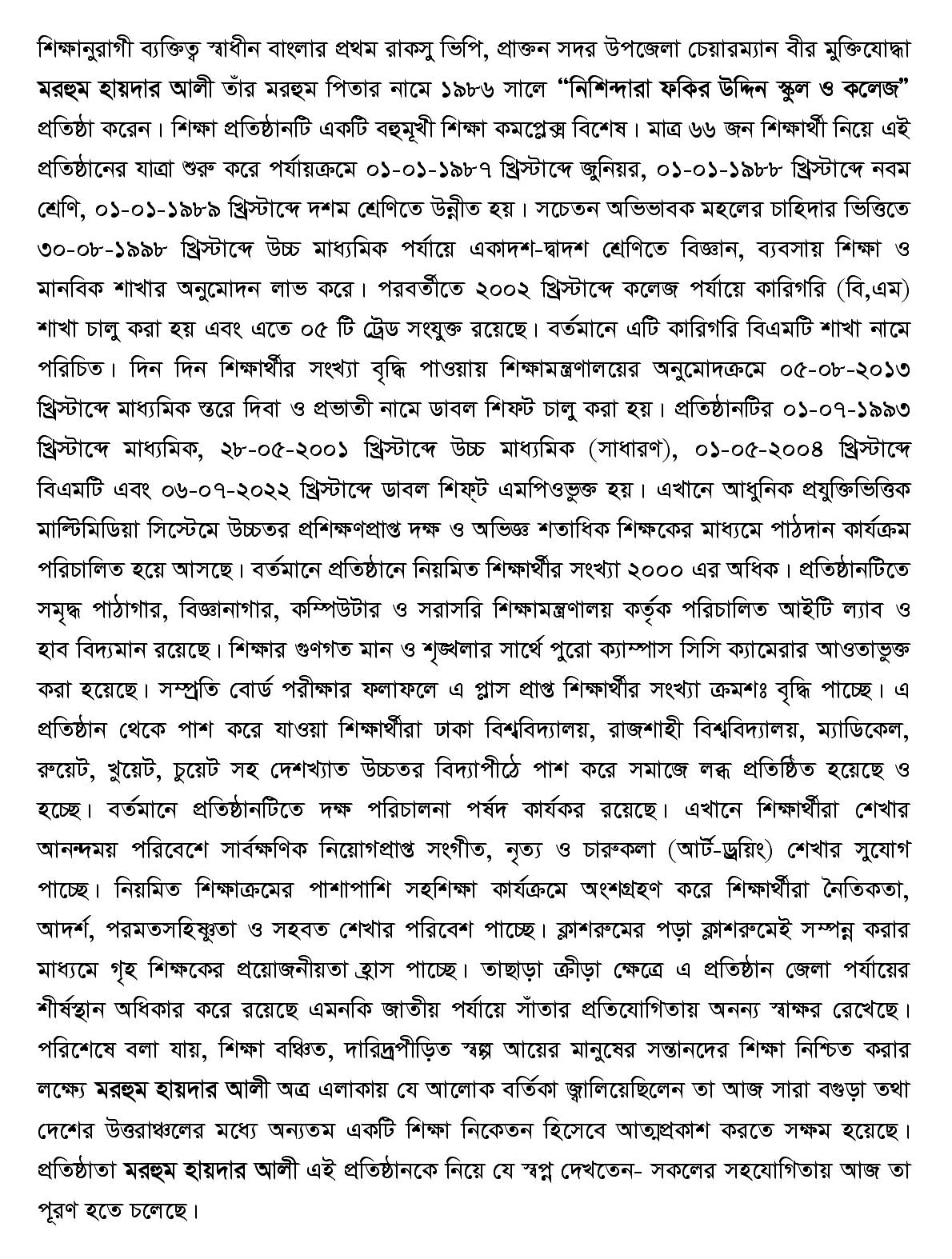 নিশিন্দারা ফকির উদ্দিন স্কুল ও কলেজ,বগুড়া ইআইআইএনঃ স্কুল ও কলেজ (জেনারেল) :119259, কলেজ (বিএমটি) : 20079